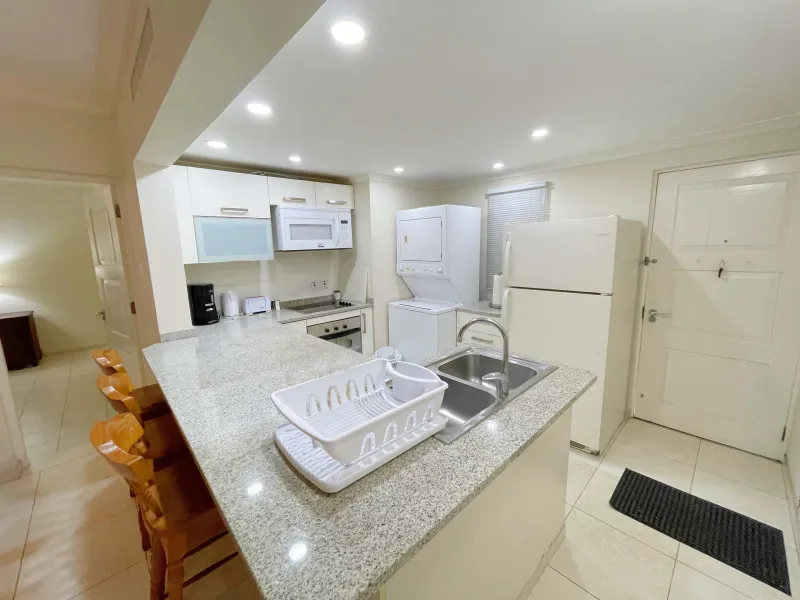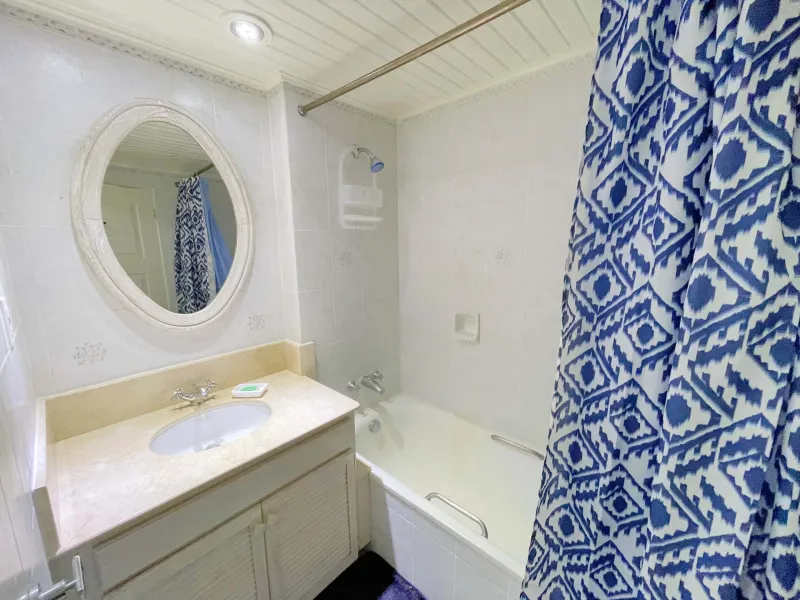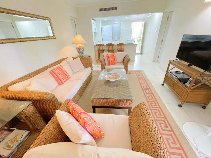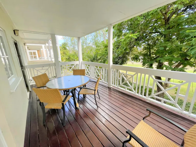 This fully furnished 2-bedroom, 2-bathroom ground floor condo is situated within the Orange Hill cluster at Rockley Golf Course in Christ Church, Barbados. The interior offers a functional layout featuring an open-plan kitchen fitted with granite countertops, modern appliances, and a stackable washer and dryer. The air-conditioned living and dining area opens onto a covered patio with views across the golf course, providing a comfortable space for outdoor dining or relaxation.