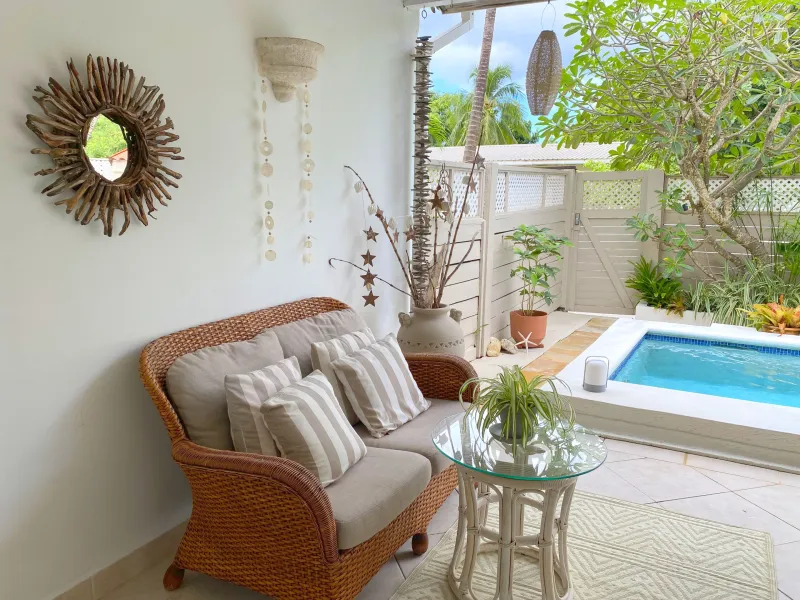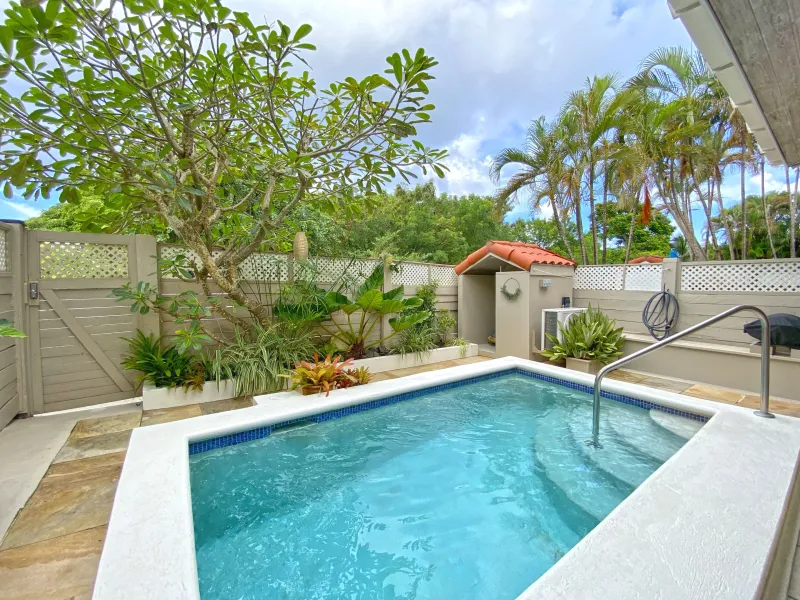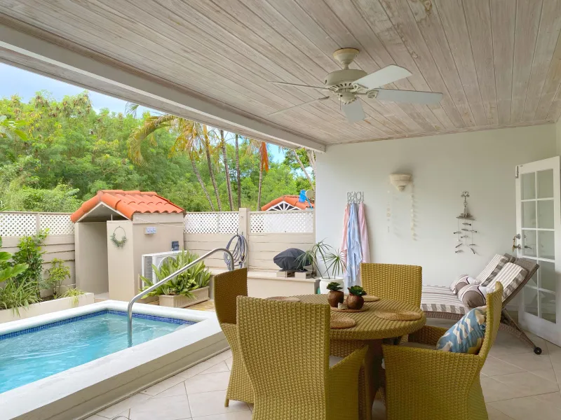Both air-conditioned bedrooms feature ensuite bathrooms, while a guest half-bath is conveniently located on the ground floor. The open-plan living and dining area leads to a spacious covered patio with a private plunge pool, ideal for relaxing or entertaining. The kitchen is fully equipped and includes a breakfast bar with stools, as well as access to a separate laundry room.