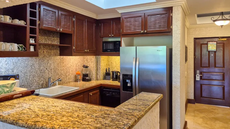 Inside, the penthouse blends refined elegance with island charm. Handcrafted mahogany furnishings and coral stone accents create a warm yet sophisticated atmosphere. The living spaces open seamlessly to a balcony overlooking verdant gardens, accessible from both the master bedroom and living room for convenience and effortless entertaining. A fully equipped granite kitchen and marble finished bathrooms add both practicality and luxury to daily living while the washer and dryer offer added comfort and convenience.
