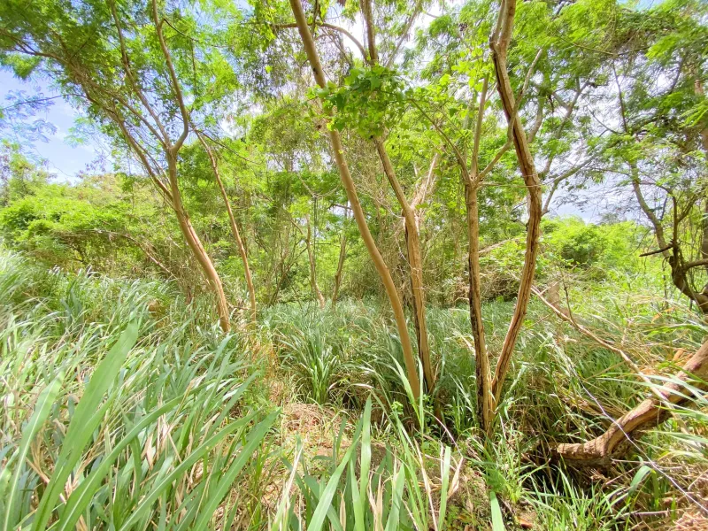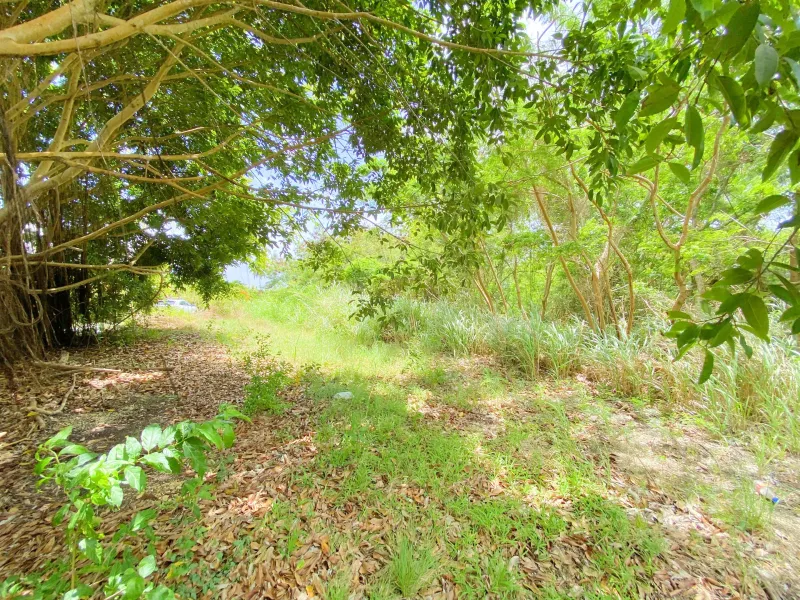 There are three beautiful, bearded fig trees planted at the entrance and there is a slight slope to the lot.